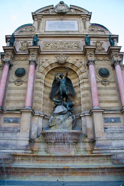 Our target was the museum at the Hôtel de Cluny, which is built on the site of now-excavated Gallo-Roman baths. (What makes them Gallo-Roman rather than just Roman?) We saw the Dame et Licorn and speculated on the larcenous nature of monkeys and wondered why the unicorn had shrunk so much in one of the panels. Along the way we stopped for more photography in the Place St Michel.