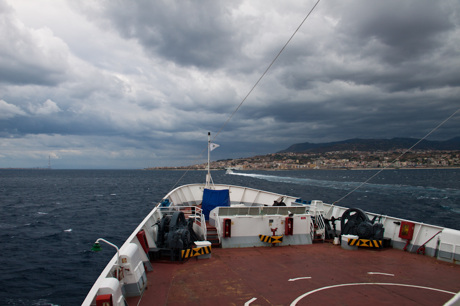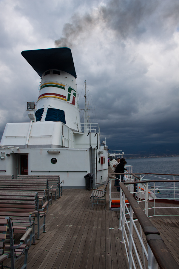 The next leg of our journey was the train to Naples. As on the way south the train crosses the Strait of Messina on a boat, this time during the day. Looking back on Sicily: